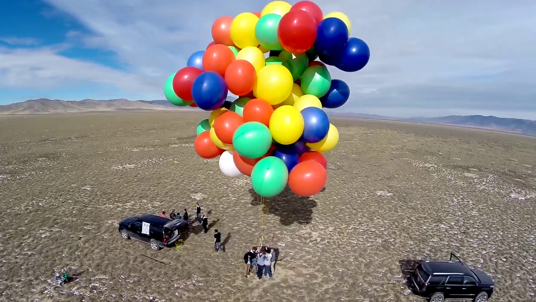 イスに巨大風船を90個くくりつけて本当に空を飛ぶ様子を撮影したムービーが公開 - GIGAZINE。
