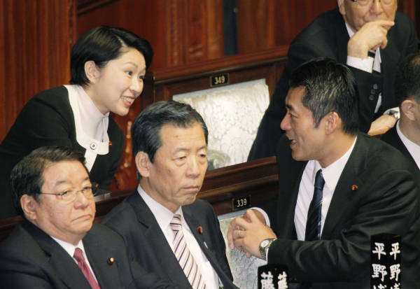 衆院本会議場で自民党の小渕優子氏 左奥 と話をする細 :細野豪志氏 写真特集:時事ドットコム。