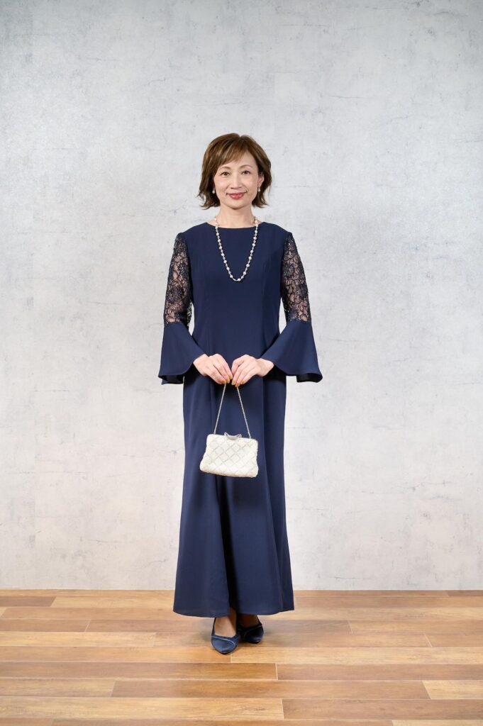 オシャレなマザードレスを上品に着こなす。新郎新婦の母ハウツードレスアップ新郎新婦の母親ドレス マザードレスレンタル。