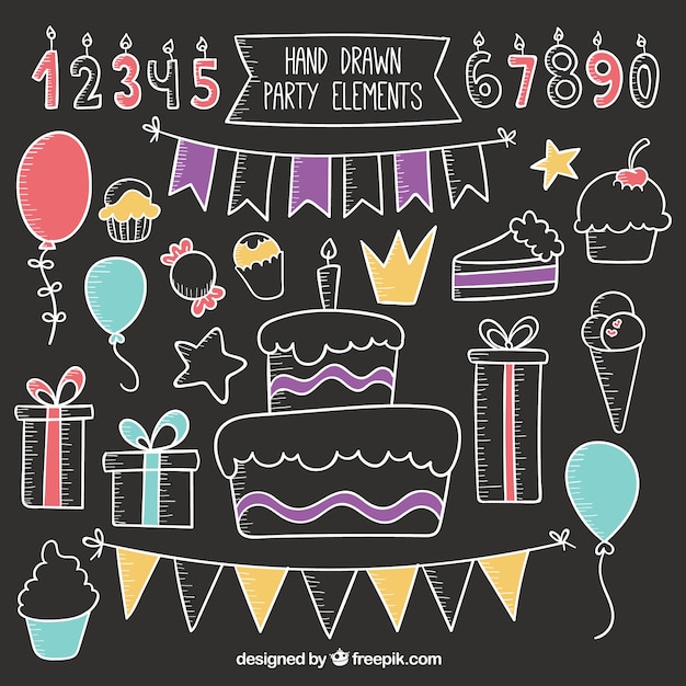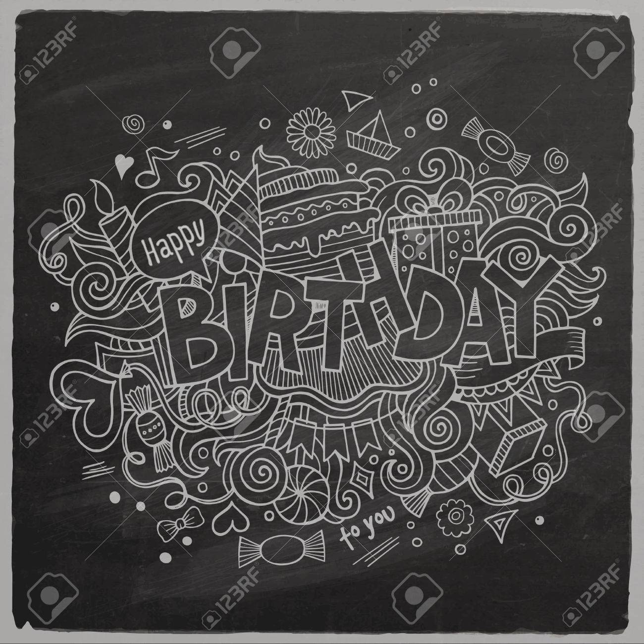 チョーク誕生日招待状黒板テンプレート。誕生日パイの手描きパーティーパンクや帽子、ケーキ、キャンディー、花輪と風船、お菓子、ギフト用の箱と弓、音符と花火、ろうそく。のイラスト素材・ベクター Image 44519706。