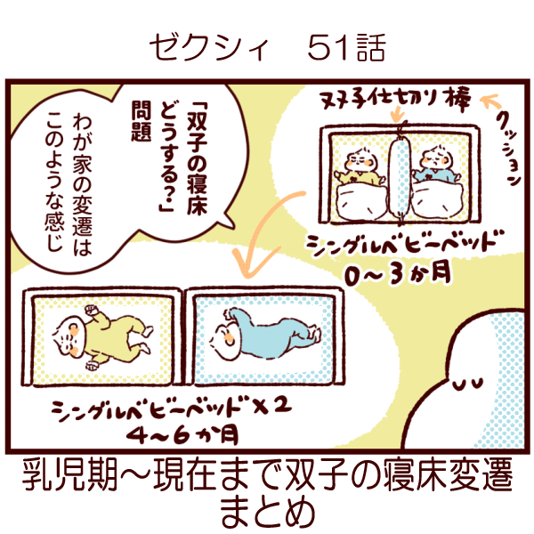 ゼクシィ51話 乳児期~現在まで双子の寝床変遷。安全な寝床って – 続々ピカ待ち☆ふたご絵日記。