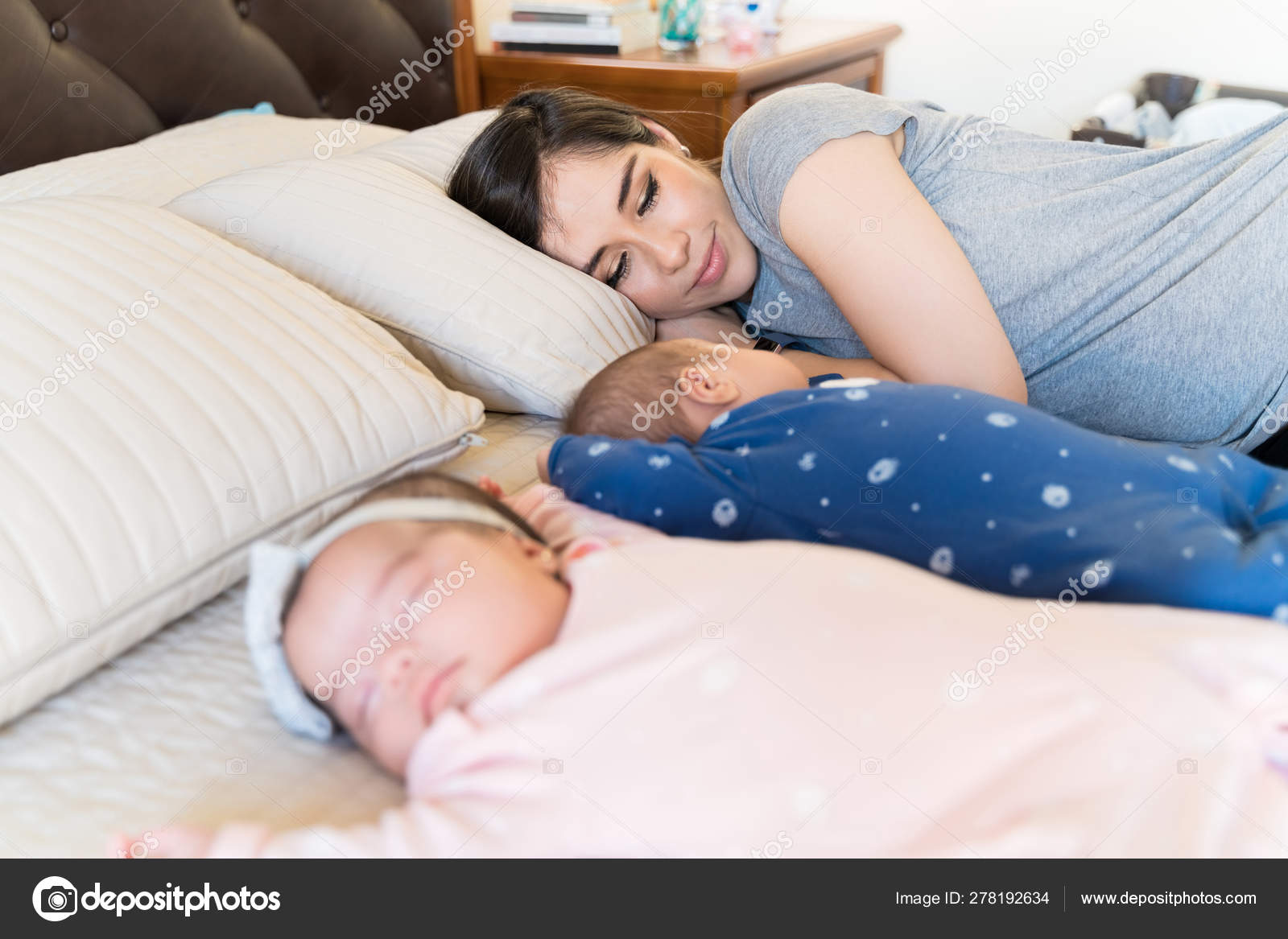 自宅でベッドの上で双子の赤ちゃんと休んでいる中間大人の母親 — ストック写真 © tonodiaz278192634。