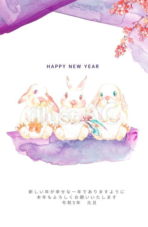 3羽のかわいいうさぎ・紫 2023年卯年の年賀状テンプレート :イラスト無料。