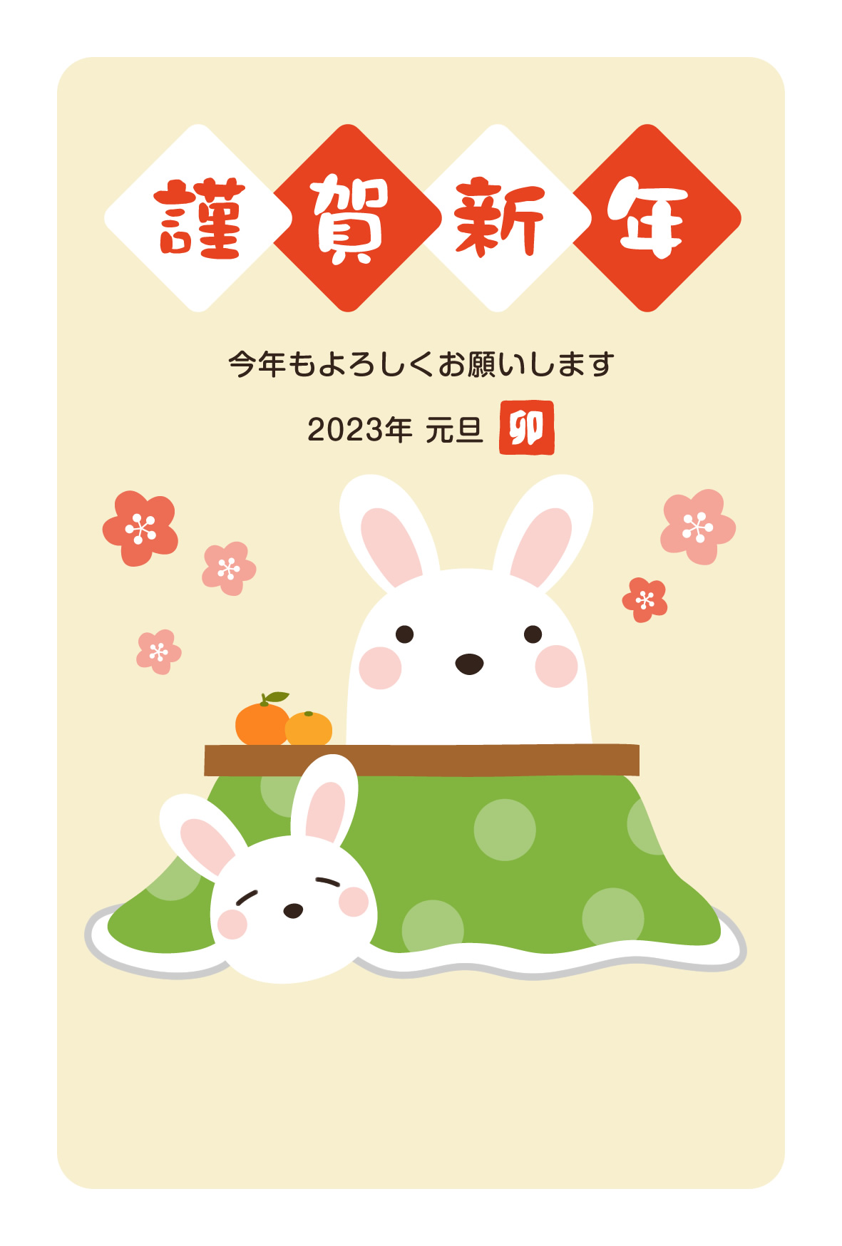 2023年賀状デザイン無料テンプレート「こたつに入るかわいいウサギ」無料フリーイラスト素材集 Frame illust。