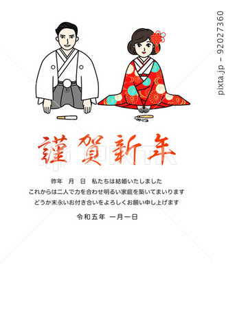 2023年 令和五年 和装の新郎新婦が並んで座っている結婚報告年賀状 色打掛と白紋付羽織袴のイラスト素材92027360- PIXTA。
