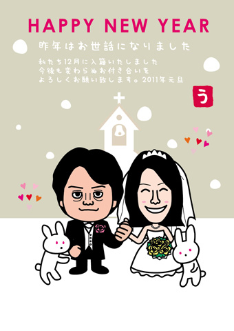 結婚報告の年賀状はうざい?いえ、イラスト年賀状は大好評です - 卯年の面白い年賀状イラスト。
