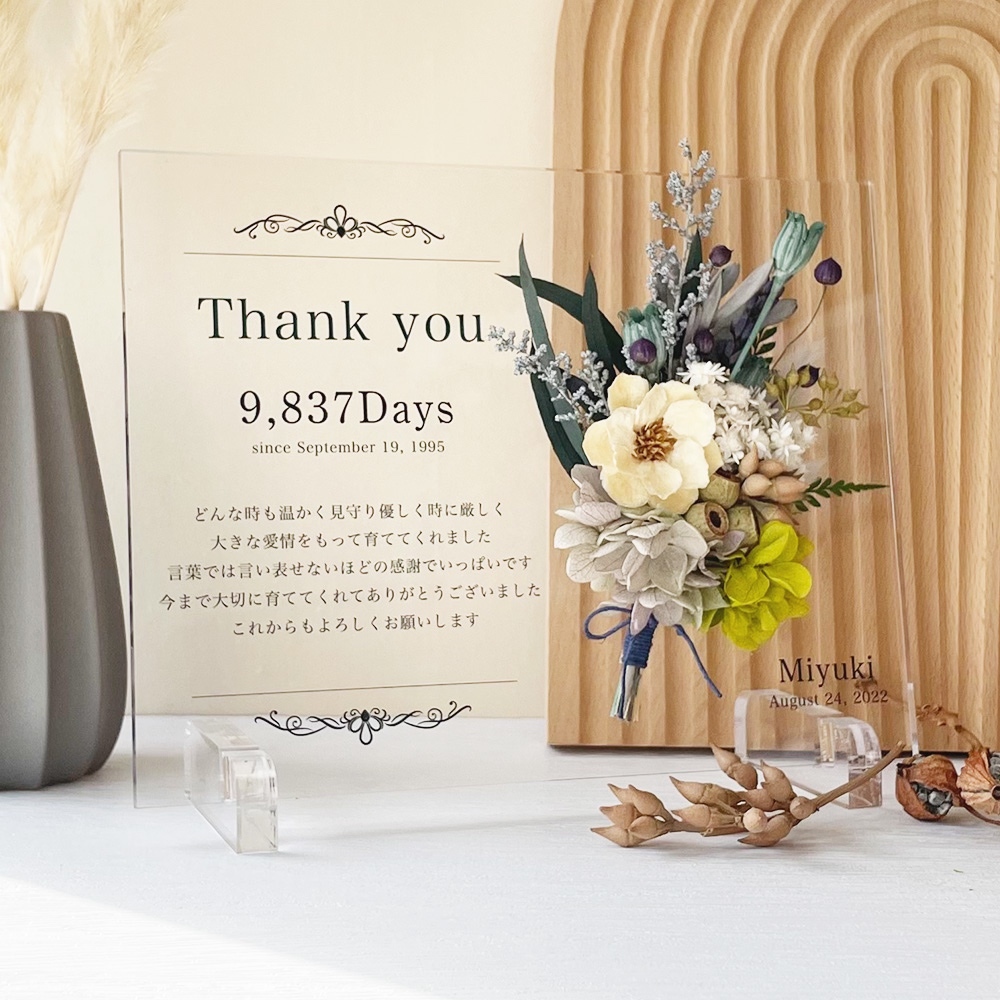 名入れ無料 アクリル感謝状 i15 20歳 子育て感謝状 婚約 結婚式 挙式 披露宴 ウエディング 記念日 誕生日 成人式 記念 披露宴 内祝い 新婚 両親親 父 母 祖父 祖母 家族 男の子 女の子 友達 プレゼント 文字入れ 花 花束 ブーケ ドライフラワー プリザーブドフラワ。