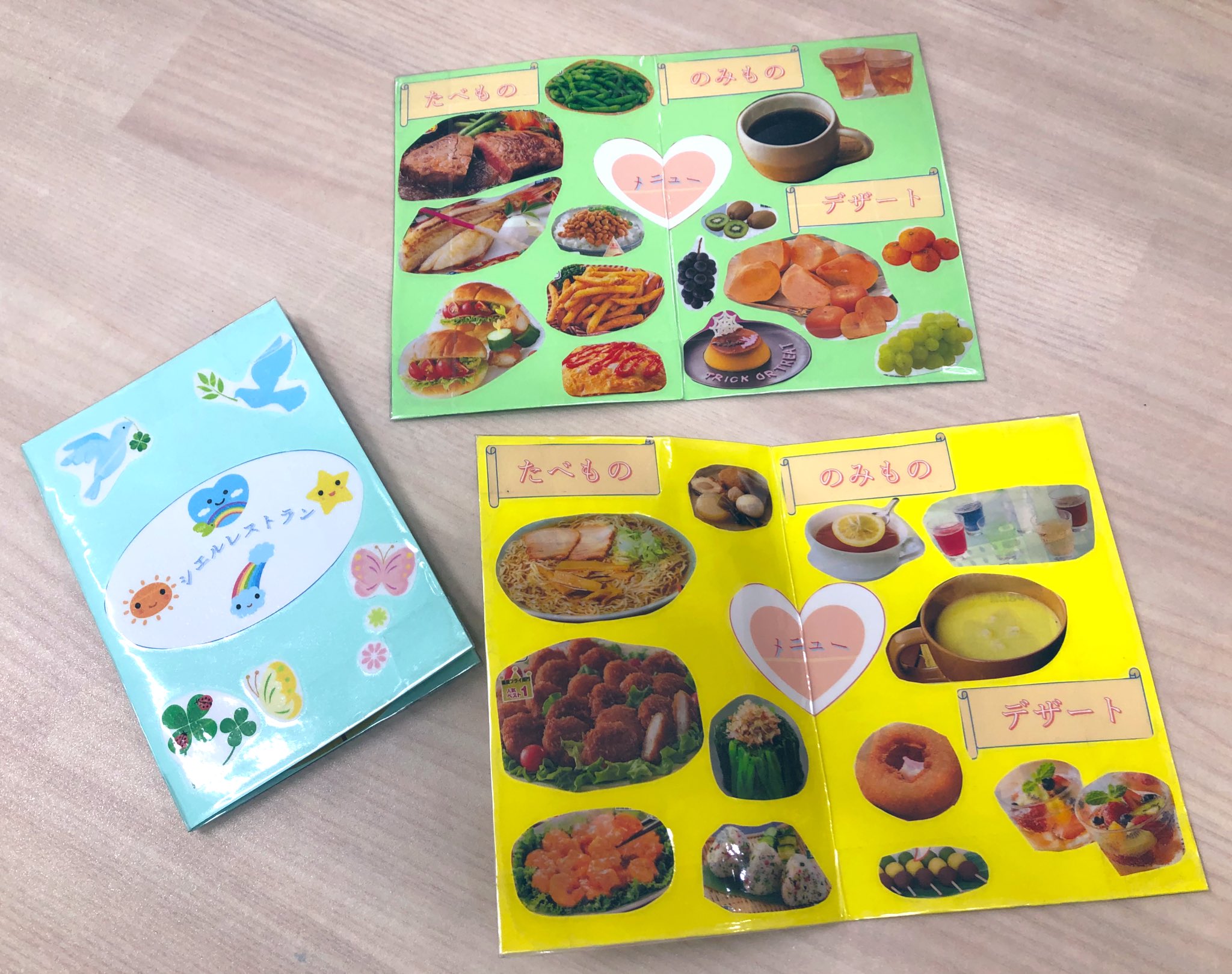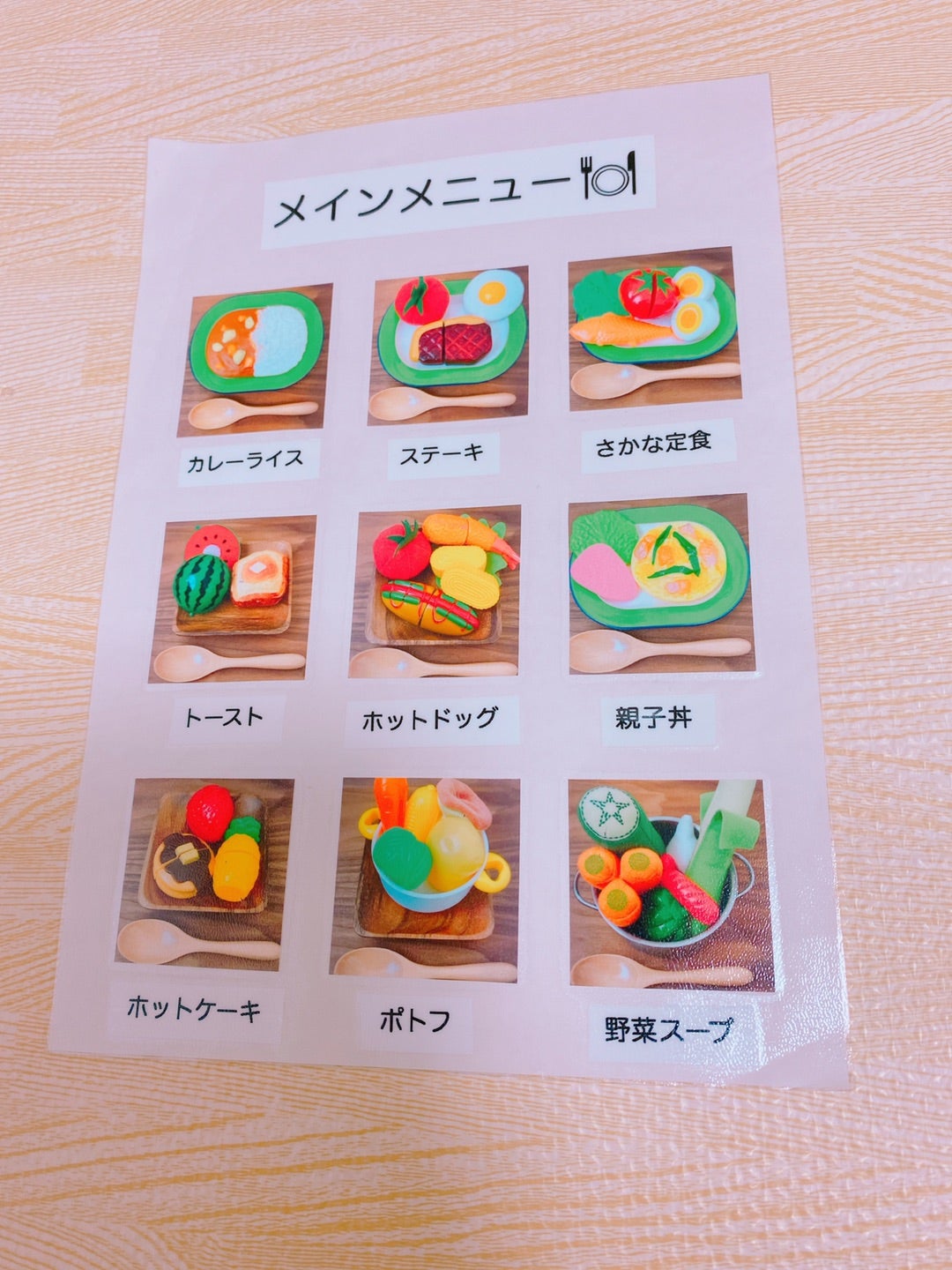 シエル小規模保育園加賀 on X: " 保育士手作りおもちゃ④メニュー表と花はじき見立て遊び広告やチラシの写真を切り取って画用紙に貼ったオリジナルメニューです! 花はじきとチェーンリングはおままごとでは見立て遊びで野菜になったりラーメンになったり子どもたち。