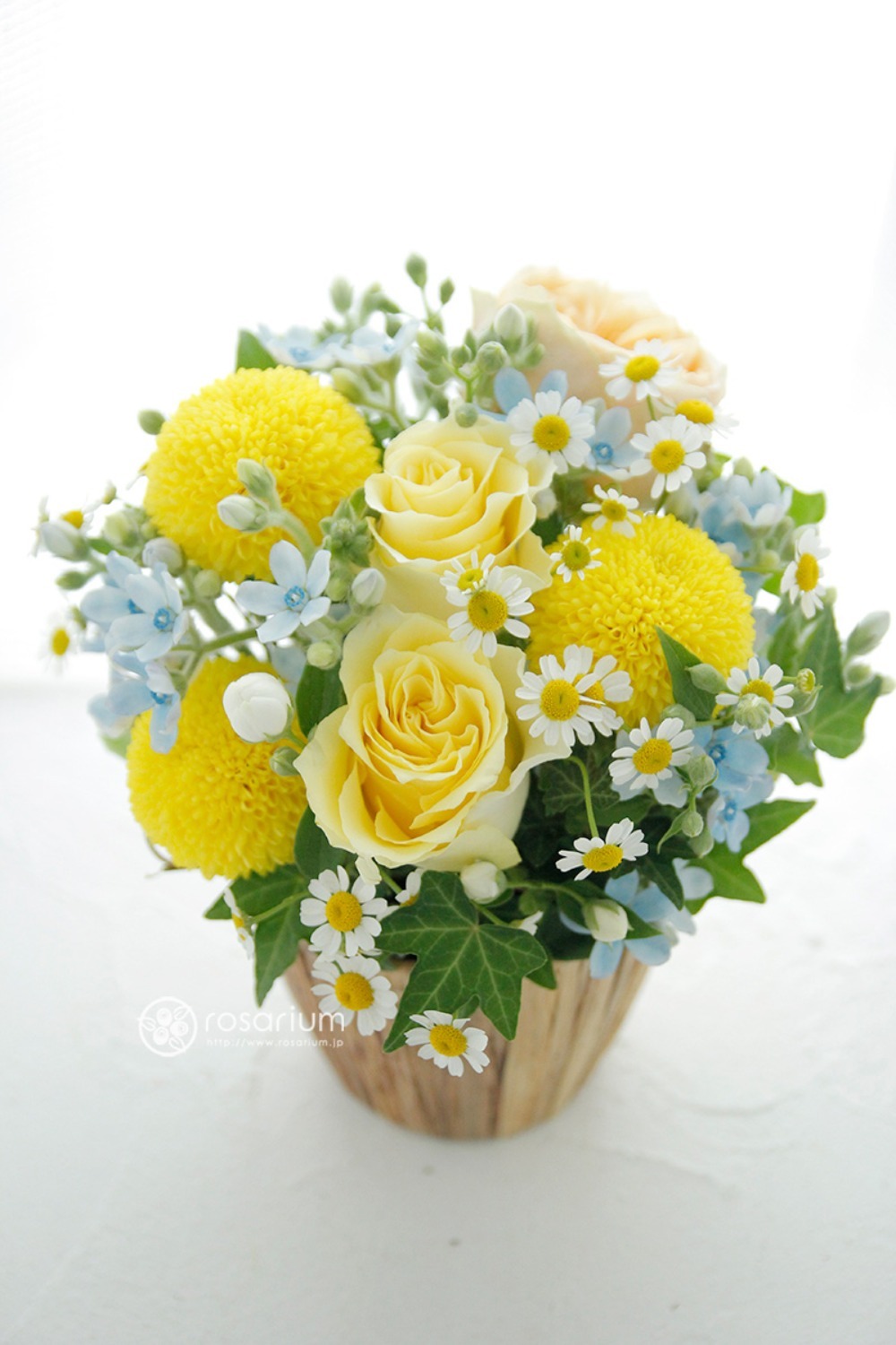 ご両親さまの結婚記念日へ」黄色とブルーが美しい祝い花結婚記念日のおしゃれな祝い花。