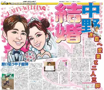 🐯阪神タイガースの中野選手のご結婚告知用の似顔絵を描かせて頂きました。 ありがとうございました😊発表当日、フォロワーのお客様がストーリーズでこの事を紹介してくださっていて、事態を把握しました😅 : ;゙゚'ω゚' :📱なるほど!そして通勤途中でサンスポげっとです。