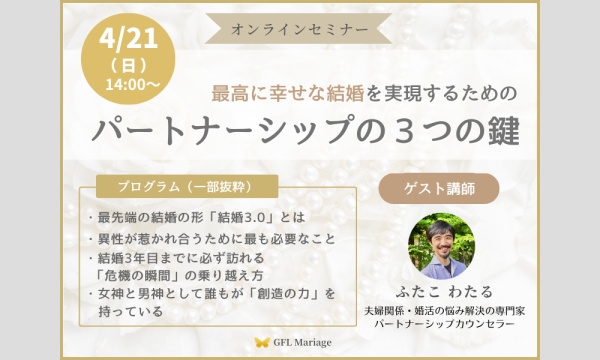 オンラインセミナー 最高に幸せな結婚を実現するための“パートナーシップの3つの鍵” - パスマーケット。