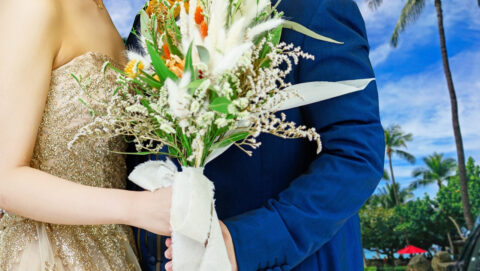ビーチで跪く日本人の新郎と花嫁242582960 の写真素材 - アフロ。