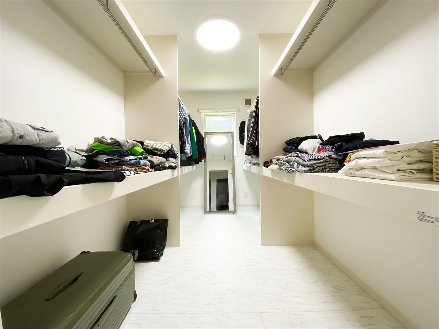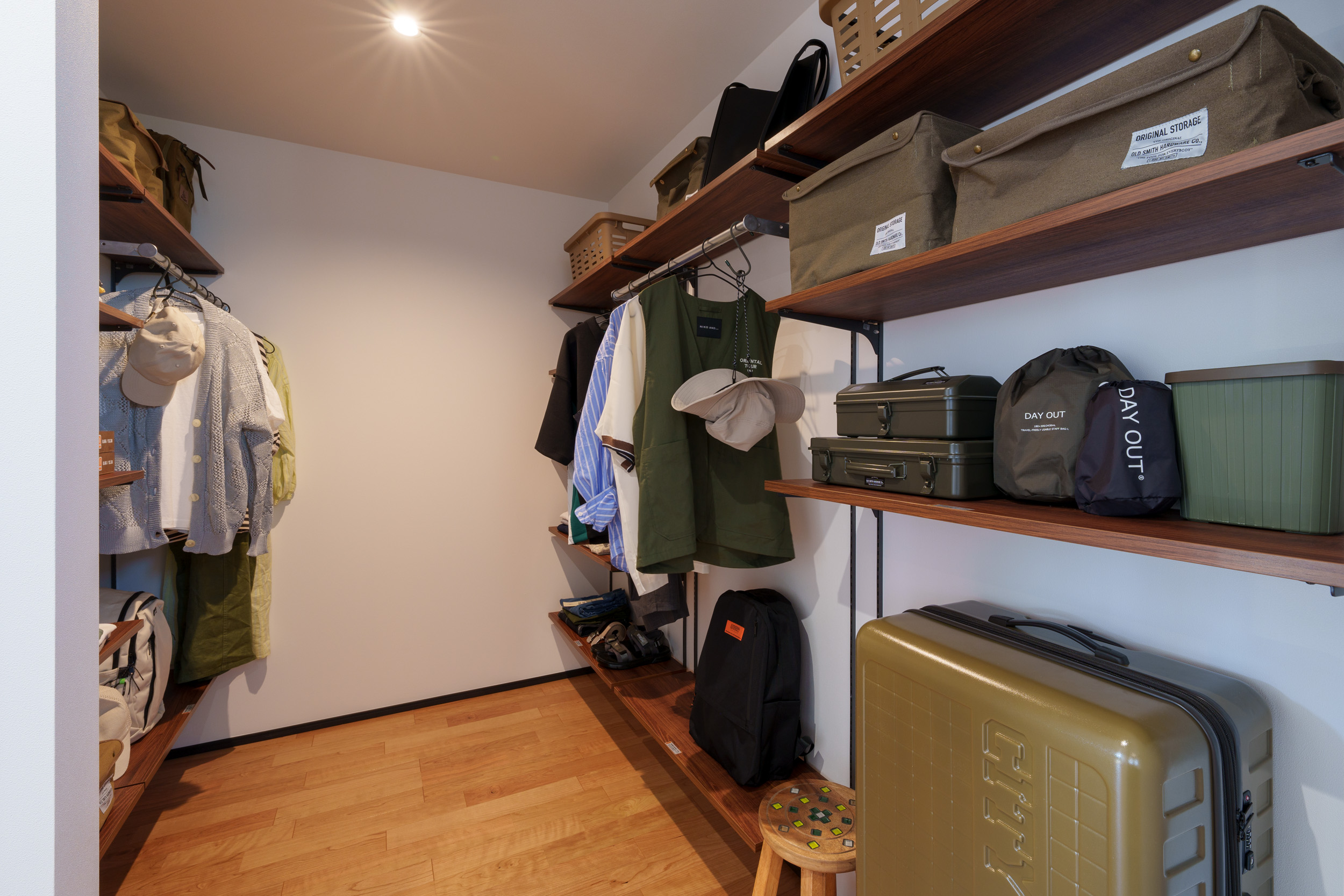 主寝室内にある5.2畳のファミリークローゼット。どこに誰の何がしまってあるかが一目瞭然で使いやすい。壁付けのハシゴをのぼると、ご主人の趣味部。