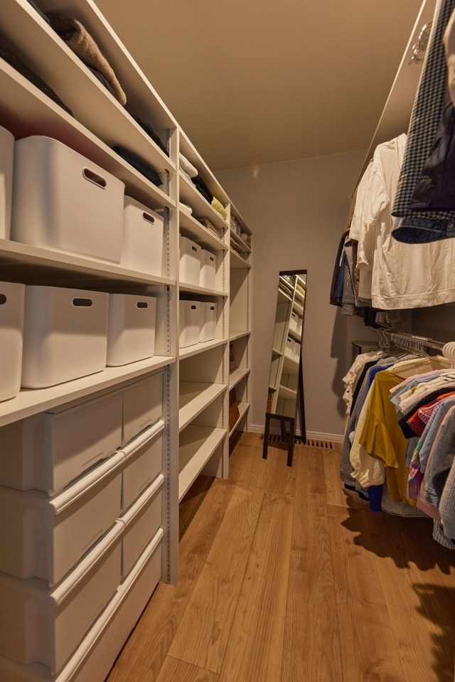 皆が集まる二世帯住宅寝室のクローゼット。 寝室にクローゼットを取る形から、 ファミリークローゼットにして、家族全員の衣類をまとめるパターンまで。洗面所、脱衣所、ランドリースペースとの関係性を考えながら、とにかく機能性を重視してのプラン。ウォークイン。