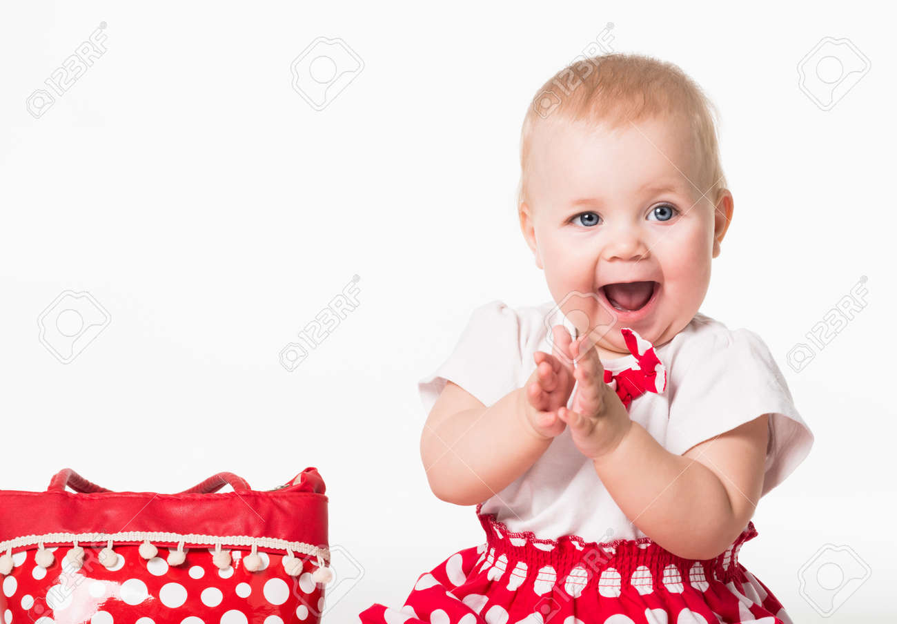 口を大きく開けて脇を向いて拍手 するかわいい子の正面図。水玉模様のバッグの横に座っているスタイリッシュなドレスを着たうれしそうな子供。白いスタジオの背景に分離。赤ちゃんのかわいらしさのコンセプト。の写真素材・画像素材Image 151319799。