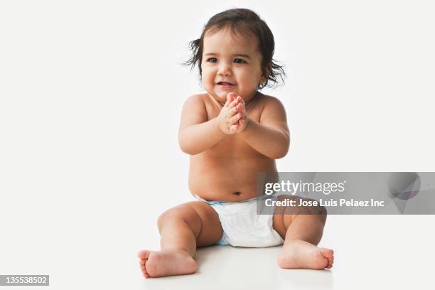 白背景を前に裸で座り手を叩く女の子の赤ちゃん 写真素材6380179- フォトライブラリ。