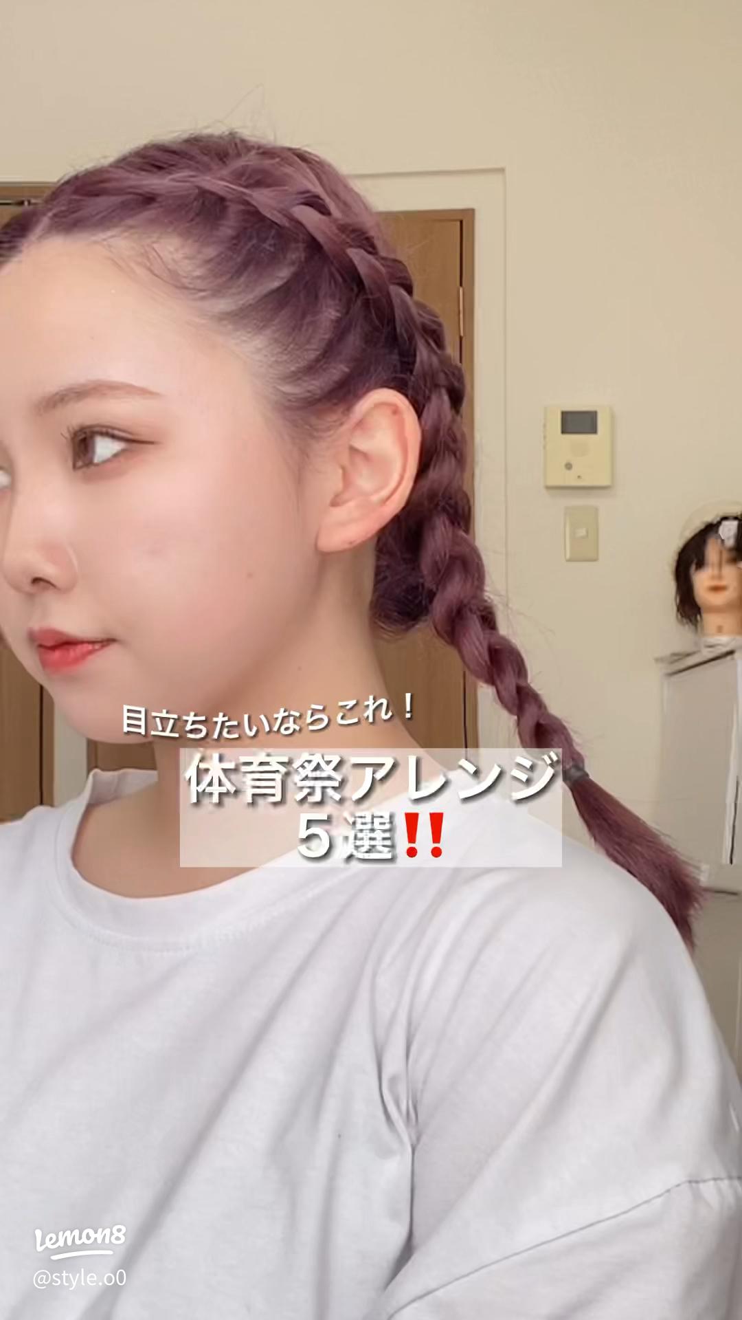 体育祭のヘアアレンジ:ツインお団子と三つ編み団子のスタイル。
