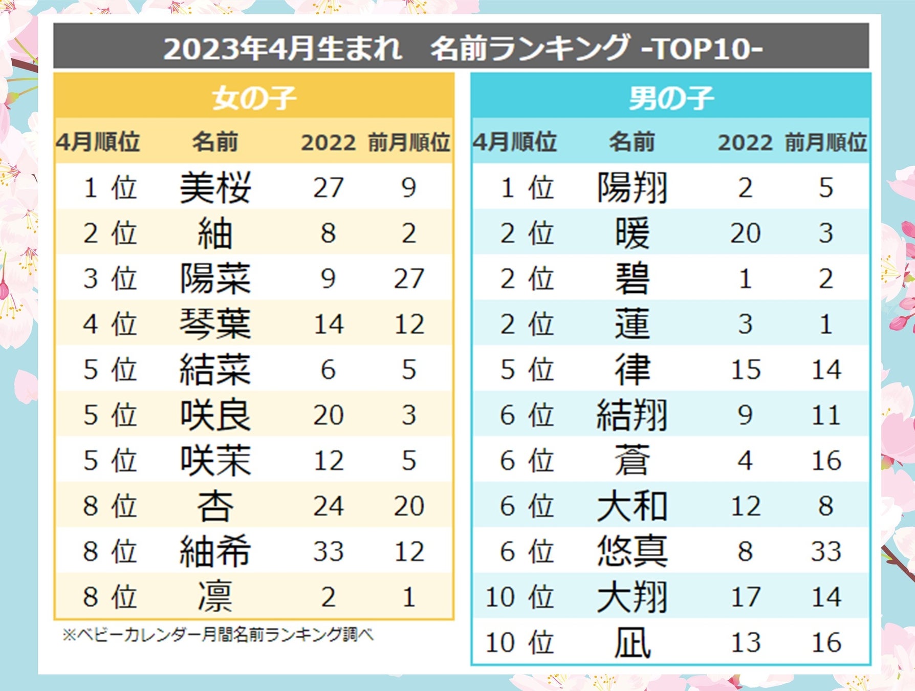 2016春にまつわる名前ランキング、男女とも「陽」が人気リセマム。