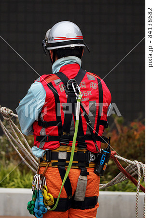 ロープなどフル装備で救助訓練を行うレスキュー隊員の写真素材84138682- PIXTA。