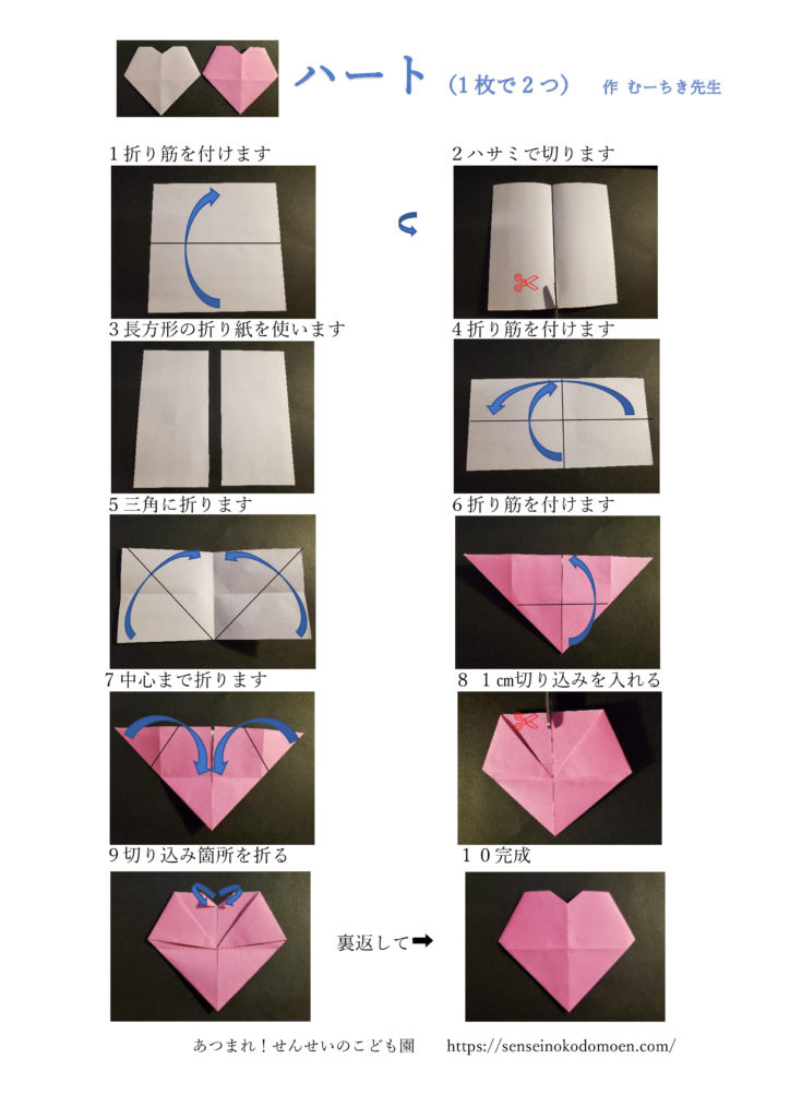 保育 優しいハートの折り紙・1枚から2つ 幼児から 年中・年長 作れますあつまれ!せんせいのこども園。