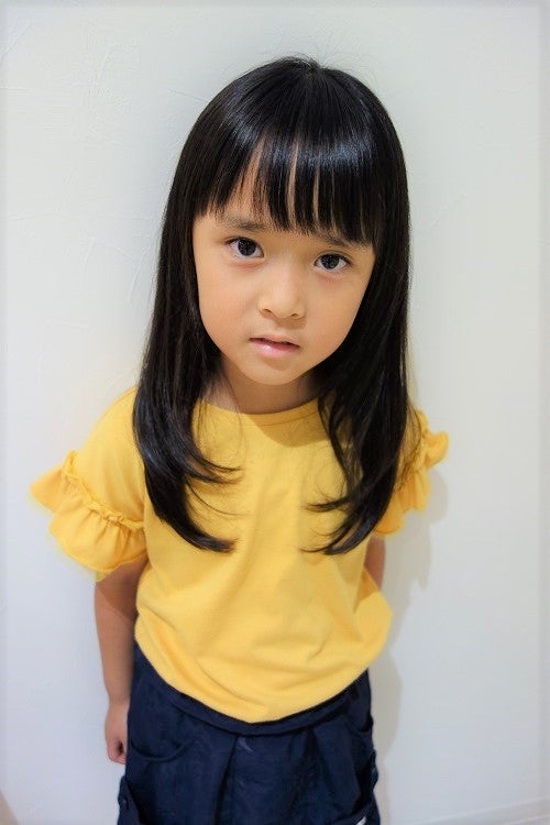 ベビーバングアシメバングオン眉アシメおんまゆ5歳ロングヘアーミディアム女の子の髪型子どもの髪型チョッキンズキッズヘア。