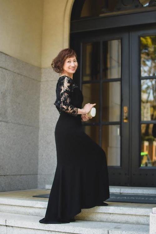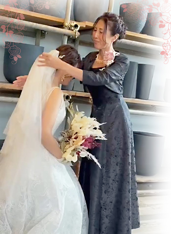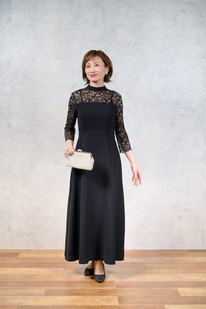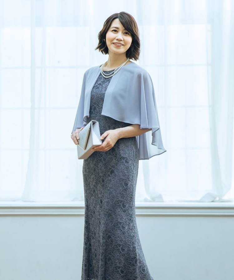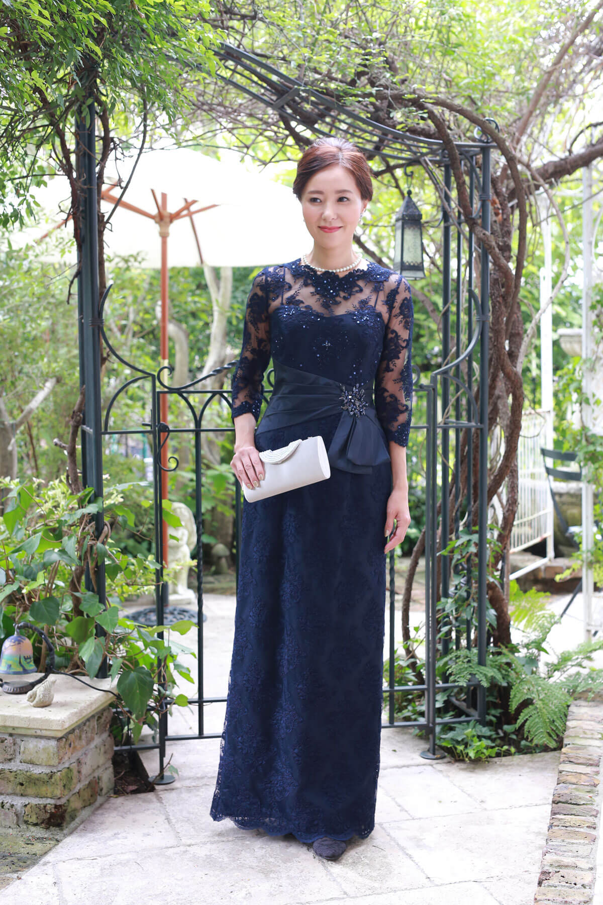 オシャレなマザードレスを上品に着こなす。新郎新婦の母ハウツードレスアップ新郎新婦の母親ドレス マザードレスレンタル。