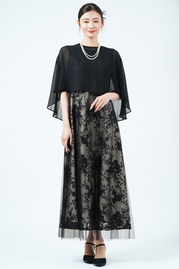 サイズ各種あり、魅惑のバラが全身に咲き誇る正礼装母親ドレス ミシェルブラックドレス+ミシェルブラックジャケット オリジナル母親ドレスレンタル ドレスのクレアロー東京・横浜元町・大宮。