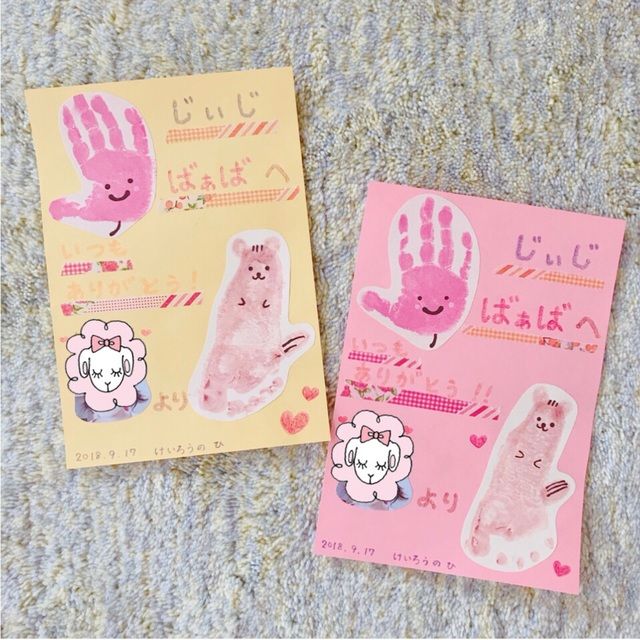 今月の手形アート 今月は『敬老の日ハガキ』です いつもお世話になっている おじいちゃん、おばあちゃんに 可愛いお子さんの手や足で😊日頃の感謝の気持ちを伝えませんか🎵 ハガキに鶴の絵が印刷されているので ペッタンするだけで簡単に仕上がりますよ お子様の「今」を。
