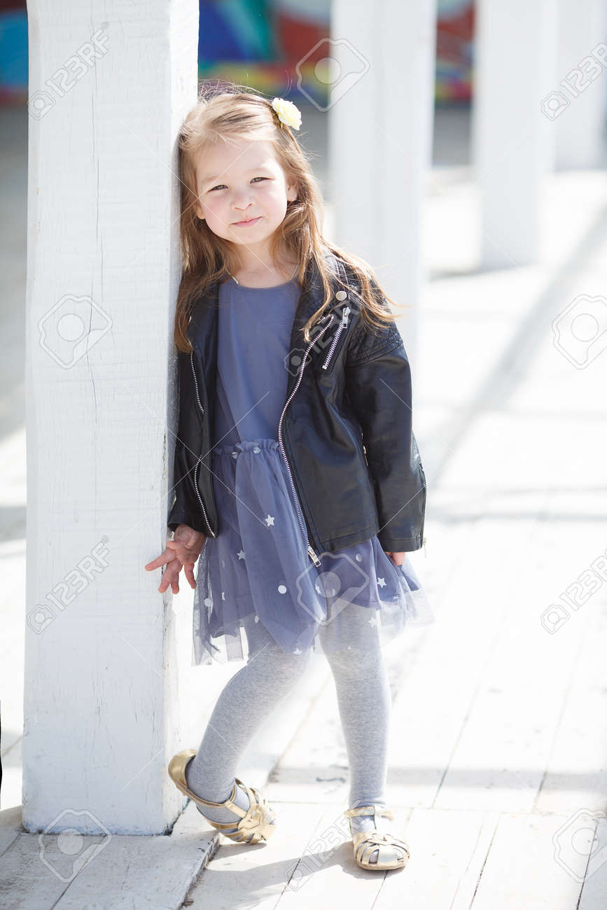 かわいい女の子 5 歳、金髪の長い髪、光沢のあるヘビ、日当たりの良い春の日に単独で屋外ポーズ青いノースリーブドレスと黒い革のジャケットに身を包んだキュートな笑顔の写真素材・画像素材 Image 87723911。