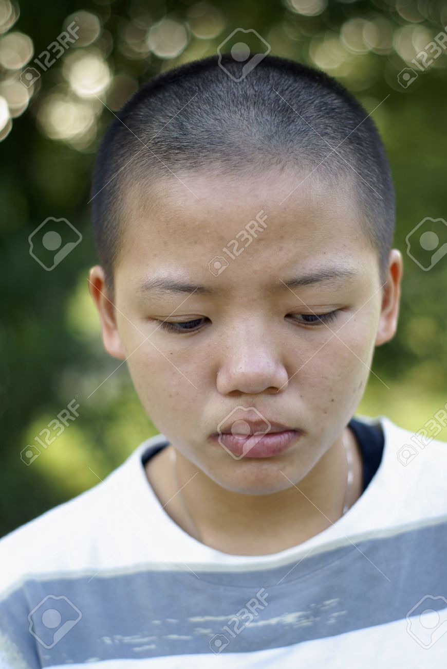 坊主頭と悲しいのアジアの十代女の子の写真素材・画像素材 Image 9264074。