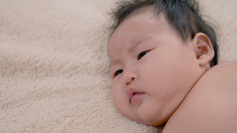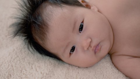 4K、新生児の顔の接写、茶色のベッドの上に横たわって、小さな男の子の目は何かを心配そうに見つめていた、子供は裸で横たわって、熱のために泣く。」の動画素材 ロイヤリティフリー 1093754253Shutterstock。