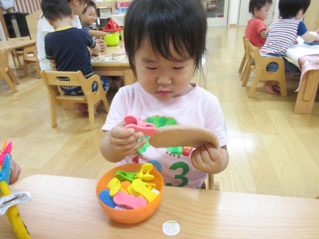 1歳うさぎ組 「洗濯バサミ遊び」深井こども園。