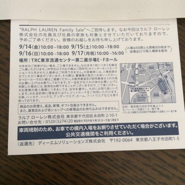 ラルフローレン ファミリーセール 招待状。