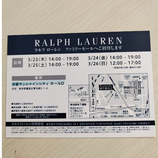 ラルフローレンRALPH LAURENファミリーセール招待状。