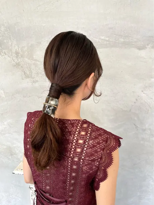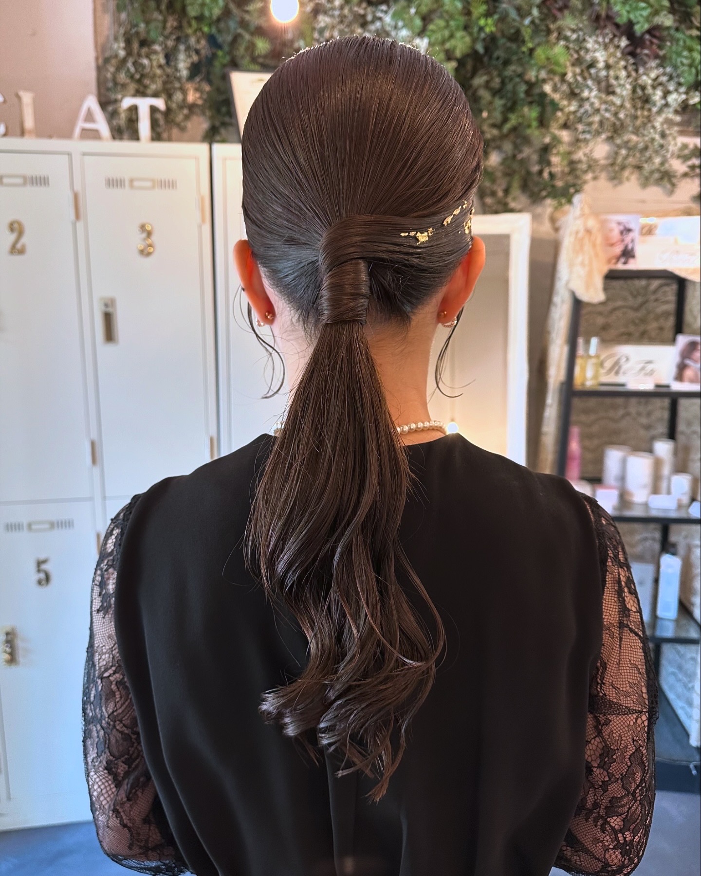 結婚式に最適なストレートローポニーのヘアアレンジ。