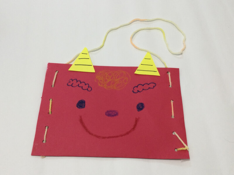 節分製作 画用紙に毛糸で縫って作る、鬼のかばんの作り方ほいくびより。