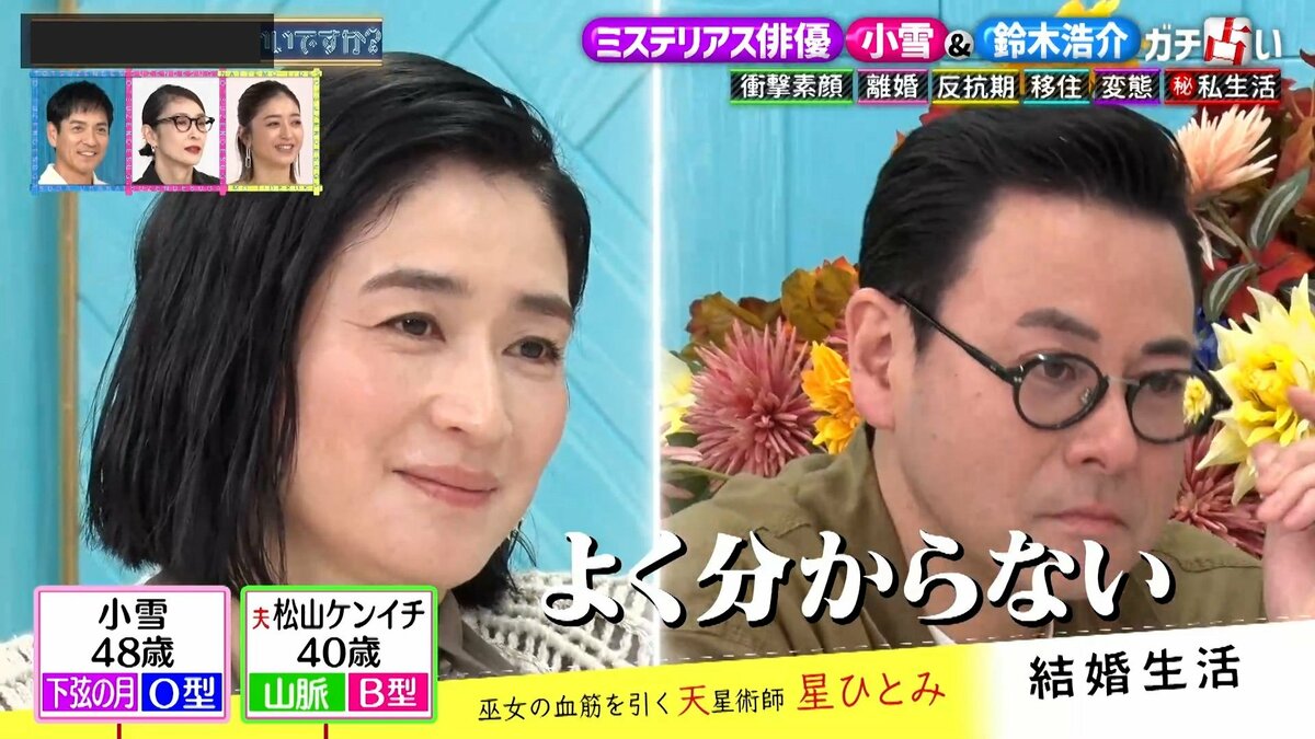 小雪 夫・松山ケンイチを「よく分からない」とバッサリ!子育てに疲れ果てた時期も 鈴木浩介は妻・大塚千弘に“捨てられる”鑑定!めざましmedia“好き”でつながる。