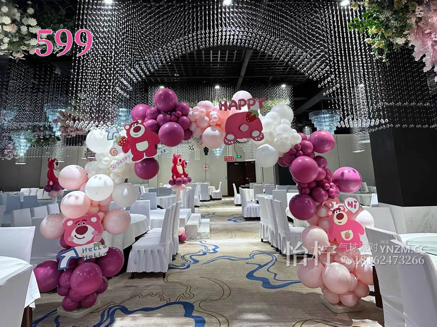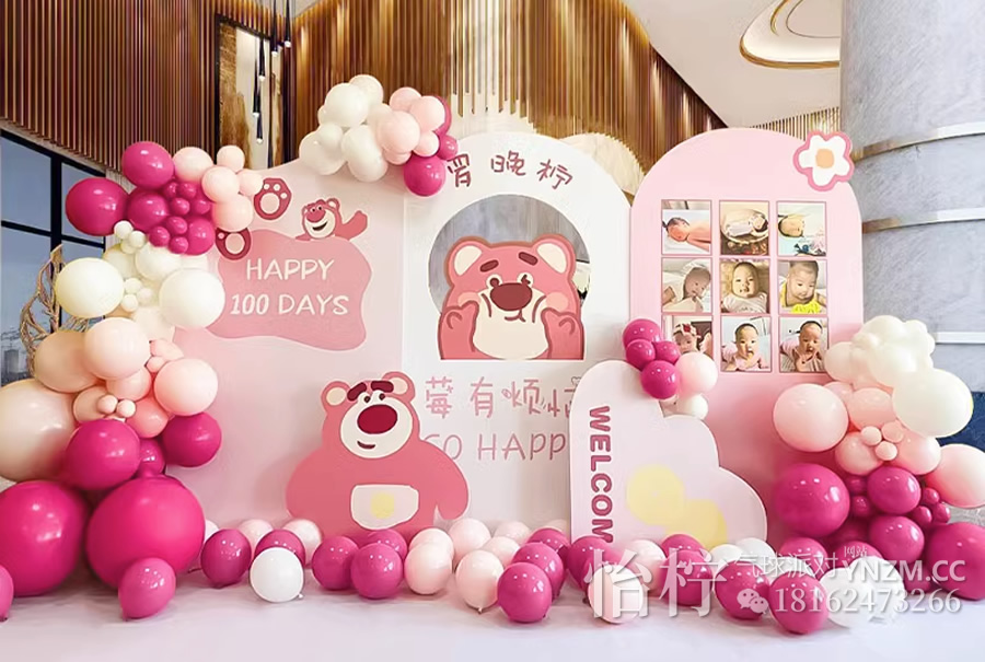 上海草莓熊主题超级可爱活泼明快华丽而不失典雅适合女孩子玫红嫩粉搭配的草莓熊主题生日宴宝宝宴背景气球装饰主题布置草莓熊满月100天周岁3岁12岁生日 场景布置生日宴布置-生日布置-怡柠婚庆礼仪上海怡柠气球派对。