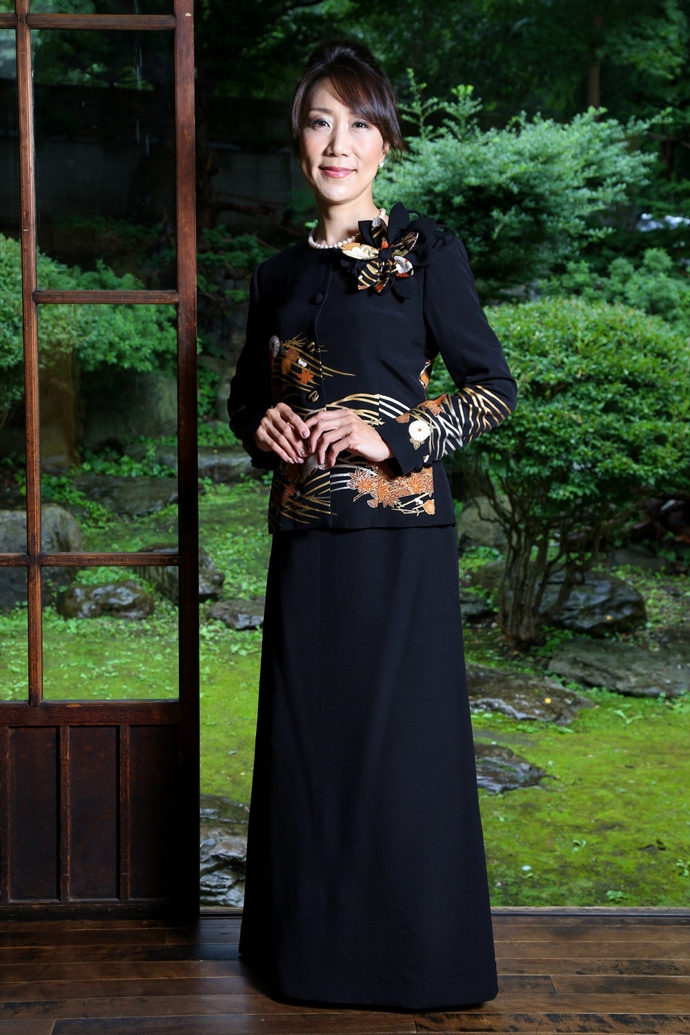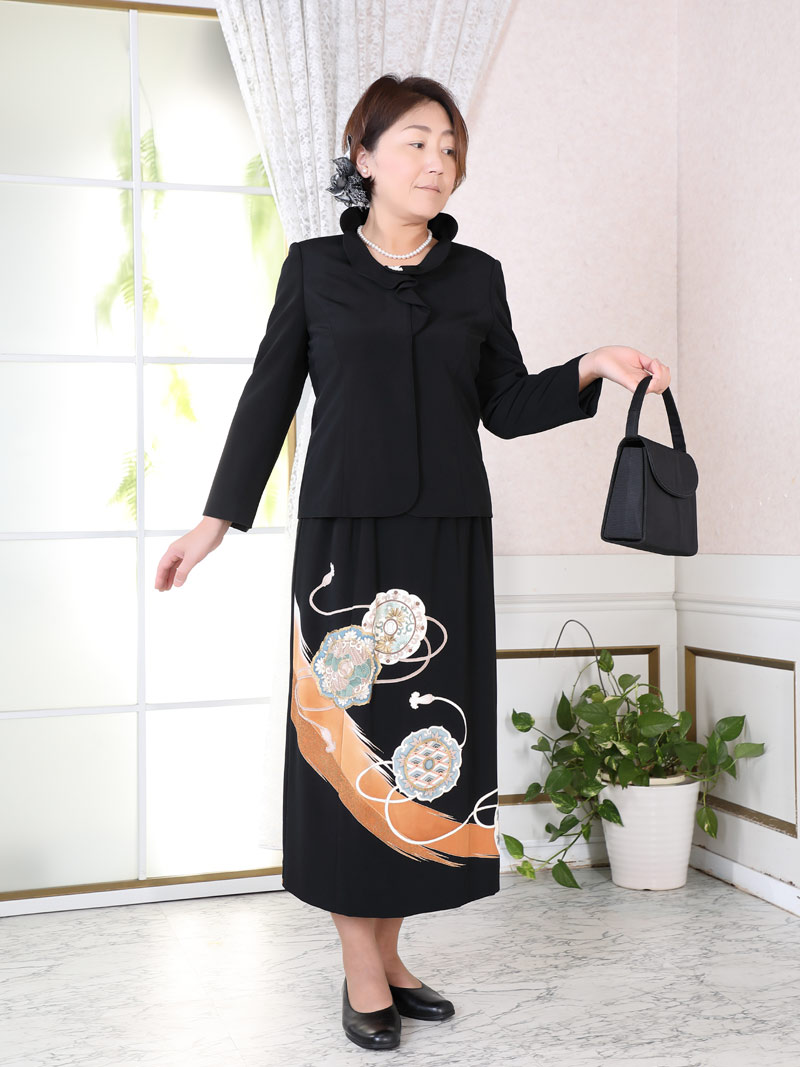 レンタル 留袖ドレス ツーピース 立ち襟ジャケットとスカート 扇模様 セパレート 黒留袖ドレス 着物ドレス 9号~11号 きものリメイク 留袖スーツ結婚式 親族 貸衣装 母 レディースフォーマル 後ろスリット 30代 40代 50代 60代 70代 80代礼服・喪服レンタルのやました。