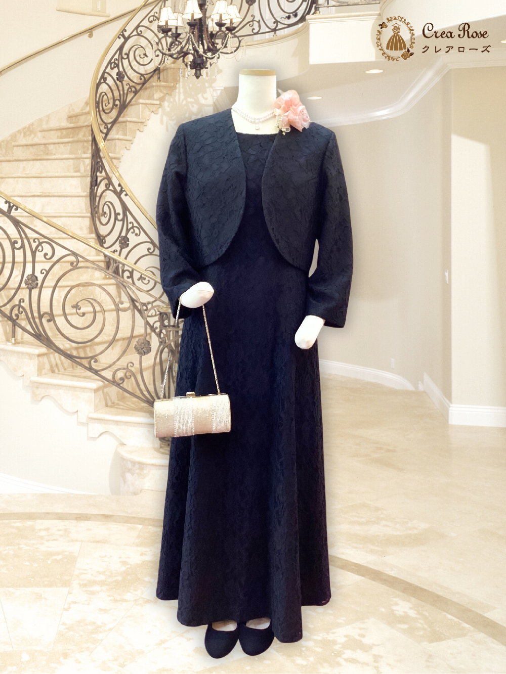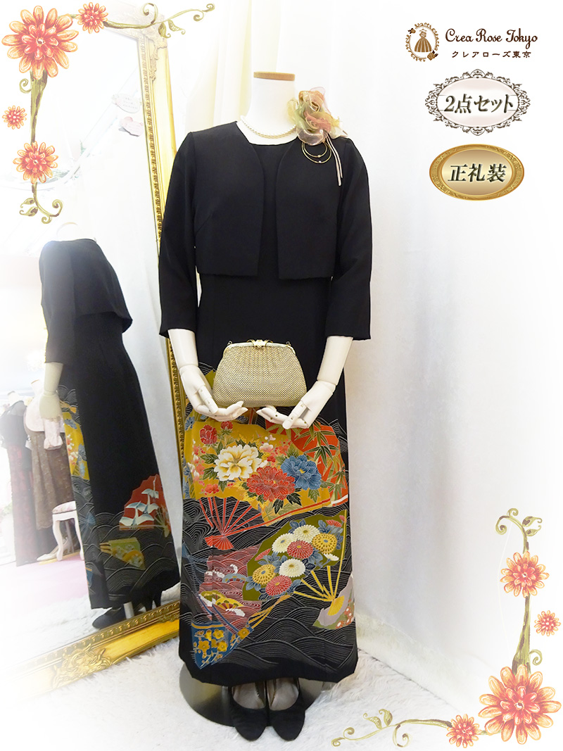 黒留袖ドレス9号の方、格調高い正絹留袖をリメイクした正礼装ドレス2点セット みやこぼたんドレス+みやこぼたんジャケット 結婚式のお母様ご親族様・ミセスのパーティーにレンタルドレスのクレアローズ東。