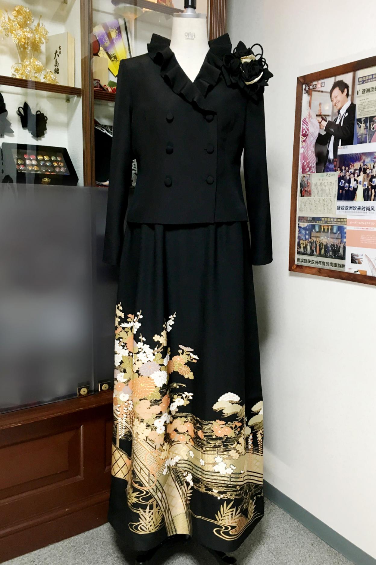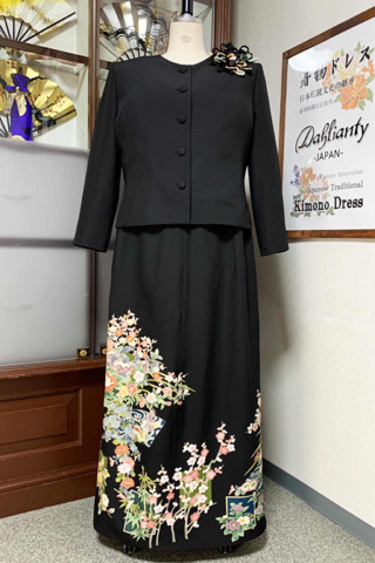 留袖ドレス 黒・金 2ピース花、扇着物ドレス・留袖ドレス Dahlianty ダリアンティー レンタル、購入、オーダーができる和ドレス 着物リメイク店。