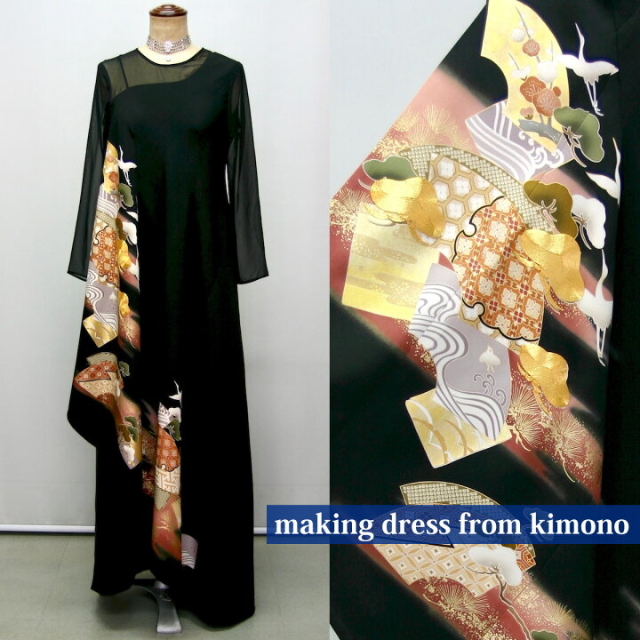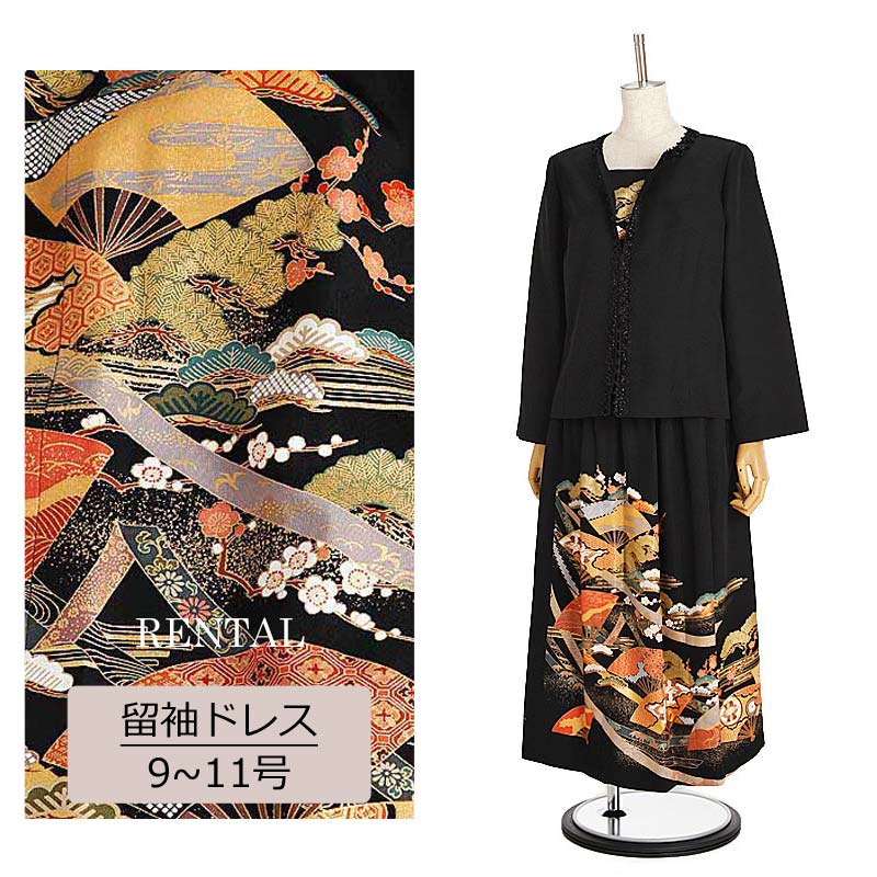 楽天市場レンタル 留袖ドレス 11号 正絹 ワンピース 鼓 末広 扇 リボンベルト付き 黒留袖ドレス きものドレス 結婚式 親族 貸衣装 母レディースフォーマル 着物ドレス ロングフォーマルワンピース 簡単着付け 着物リメイク 30代 40代 50代 60代 70代 80代。
