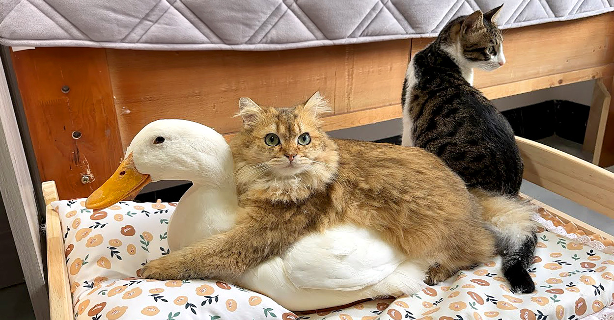 大好きな子猫と一緒に寝ることに執着するアヒル。ふたりのラブラブな様子に、ちょっと気まずくなる同居猫が面白い♡エウレカ。