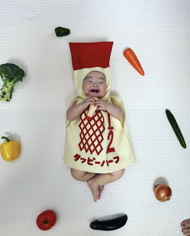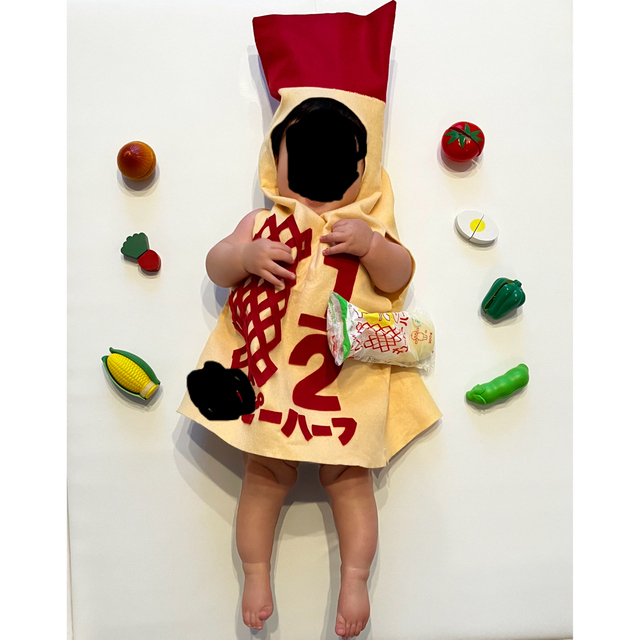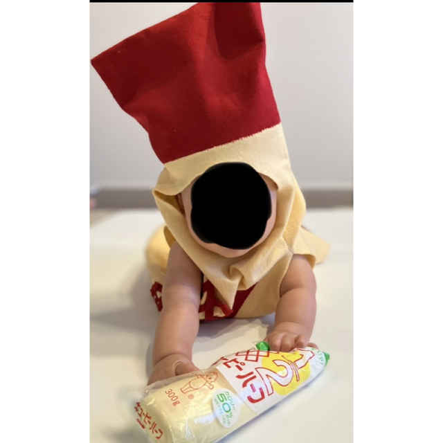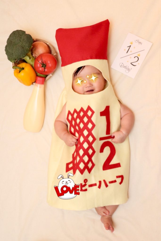 mamagirl_jp ハーフバースデーを手作りキューピーマヨネーズコスでお祝い💓 すっぽりハマってめ〜ちゃっ可愛い⭐️✨ @kotomi5312さんの投稿を引用させていただきました✍️ ・ 最後は アラピーハーフ.ᐟ.ᐟ👶🏻 作ると思って。