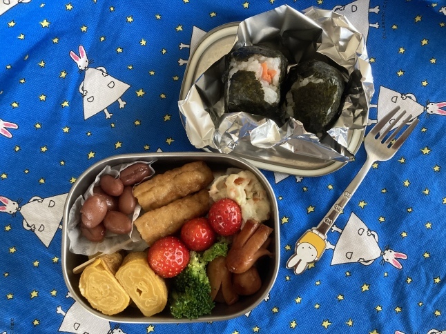 保育園お弁当  お別れ遠足で動物園へ 行きはたまたま姉弟クラスが一緒に行くことになって ふたりで手を繋いで歩いたそう🤝 家でも園でも仲良しのおふたりさん  🧡5歳 姉 ・おにぎり ・チキンナゲット ・ポテト ・卵焼き ・ハム ・ブロッコリー ・苺、りんご  💙3歳。