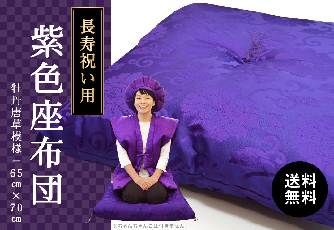 古希・喜寿・卒寿紫色のお祝い用座布団 牡丹唐草模様。