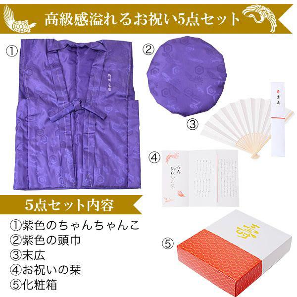 楽天市場 全品対象☆最大1000円クーポン配布中☆10 21まで 古希 紫 ちゃんちゃんこ 古希祝い セット 5点 大黒頭巾 末広 白扇子 栞 化粧箱中綿入り 長寿 喜寿 傘寿 卒寿 パープル 敬老 送料無料 : きもの館 創美苑。