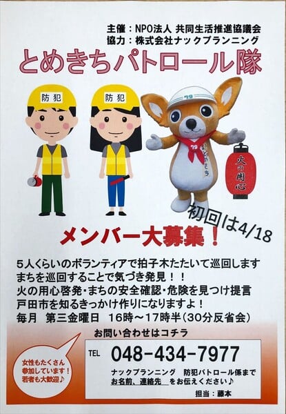 着ぐるみと一緒に「火の用心」で防犯啓発を巡回しながら街の危険を見つける! by NPO法人共同生活推進協議会。