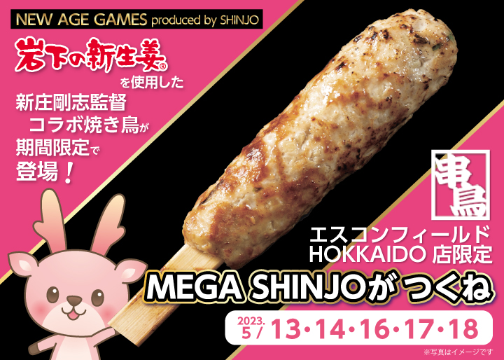 新庄剛志監督コラボグルメ 串鳥エスコンフィールド HOKKAIDO店で『MEGASHINJOがつくね』を5月13日から18日まで販売。~道民のソウルフード・串鳥 NEW AGE GAMES produced bySHINJO 限定メニュー~岩下食品。