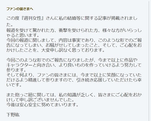 声優の下野紘が結婚公表家庭に関する報道受け、ブログで説明「このような形でのご報告になってしまい」「大変申し訳なく」1分エンタ。